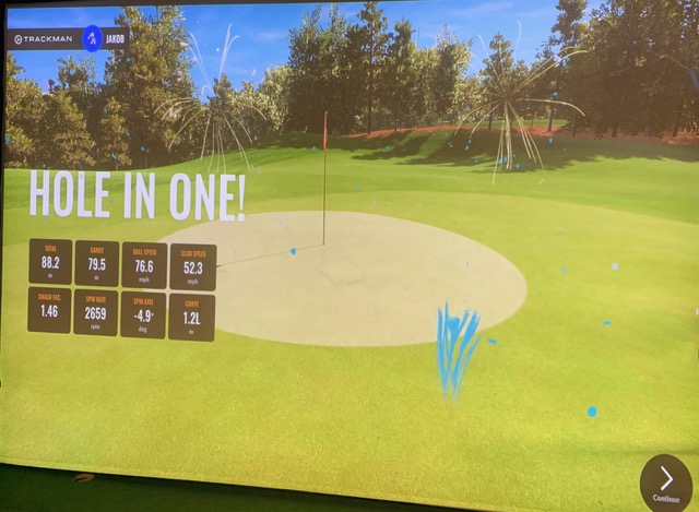 Under treningsturneringen i Kristiansund i forrige uke slo Jakob hole in one under simulatortrening. Slaget ble møtt med spontan jubel og applaus fra de andre deltakerne.